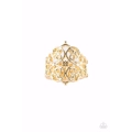 Brushed in a glistening finish, shimmery gold filigree vines curl across the finger, coalescing into an airy frame for a vintage-inspired look. Features a stretchy band for a flexible fit.