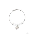 Flanked by classic silver beads, a decorative silver heart charm swings between a row of white cat's eye stone beads that are fitted in place along a dainty silver bangle for a vintage vibe.