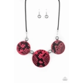 A wild collection of oversized silver beads and black and pink python patterned leather pieces are strung along an invisible wire below the collar for statement-making finish. Features an adjustable clasp closure.