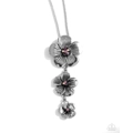 Featuring a mismatched display of purple multicolored rhinestones, three textured silver flowers link and decrease in size at the bottom of a silver snake chain, creating a noisemaking whimsical display down the chest. Features an adjustable clasp closure.