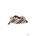 Black, brown, and white cording weave across the wrist, creating a colorful braid. Features an adjustable sliding knot closure.