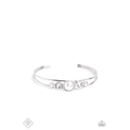 Encrusted in glittery white rhinestones and classic white pearls, dainty silver bars curl around the wrist, creating a timeless cuff.