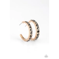 Gradually increasing in size near the center, glassy hematite rhinestones are encrusted down the spine of a dainty gold hoop for a grunge-glamorous look. Earring attaches to a standard post fitting. Hoop measures approximately 1 1/4" in diameter.