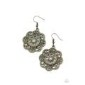 Featuring a rustic patina finish, a decorative mandala-like brass frame swings from the ear for a whimsical look. Earring attaches to a standard fishhook fitting.