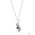 A silver chain suspends a collection of whimsical charms, including a horseshoe, a brass cowboy hat, a silver star, and a silver cowboy boot. A lobster clasp hangs from the bottom of the design to allow a name badge or other item to be attached. Features an adjustable clasp closure.