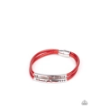Featuring tribal inspired cutouts, stenciled silver bars slide along two shiny red cords around the wrist for an adventurous look. Features a magnetic closure.
