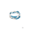 Infused with dainty silver beads, cylindrical silver rods, and swirly silver accents, a mismatched collection of Mykonos Blue crystal-like and acrylic beads are threaded along a wire that coils around the wrist for a versatile pop of color.