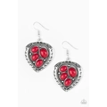 Varying in size, polished red beads are sprinkled across the center of an asymmetrical heart-shaped frame for a whimsical look. Earring attaches to a standard fishhook fitting.