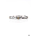 Embossed in swirling silver and feather like detail, antiqued silver frames are threaded along stretchy bands around the wrist. Earthy green stones adorn the centers of the Southwestern frames for a seasonal finish.