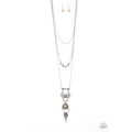 Three shimmery silver chains layer down the chest. Infused with Soybean beaded accents, a stacked tribal pendant swings from the lowermost chain, while dainty silver plates connect along the bottom of the centermost chain for a seasonal flair. Features an adjustable clasp closure.