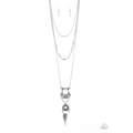 Three shimmery silver chains layer down the chest. Infused with white beaded accents, a stacked tribal pendant swings from the lowermost chain, while dainty silver plates connect along the bottom of the centermost chain for a seasonal flair. Features an adjustable clasp closure.
