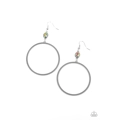 A slim oversized silver ring, highlighted by two concentric circles of dotted texture, dangles from an oval oil spill gem for an edgy refined look. Earring attaches to a standard fishhook fitting.