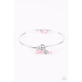 Dainty silver beads and glassy pink beads swing from a dainty silver bangle for a seasonal look. Features a toggle clasp.