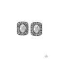 An oval hematite gem is pressed into a square silver frame radiating with glittery hematite rhinestones and triangular patterns for an edgy refinement. Earring attaches to a standard post fitting.