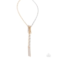 A sleek gold and silver paperclip link chain showcases an industrial-inspired zipper pendant. The gold zipper features a functional design that slides along the chain, suspending dual chain tassels at its base. The tassels are adorned with glittering rhinestones, adding a touch of elegance to the edgy aesthetic. Features an adjustable clasp closure.